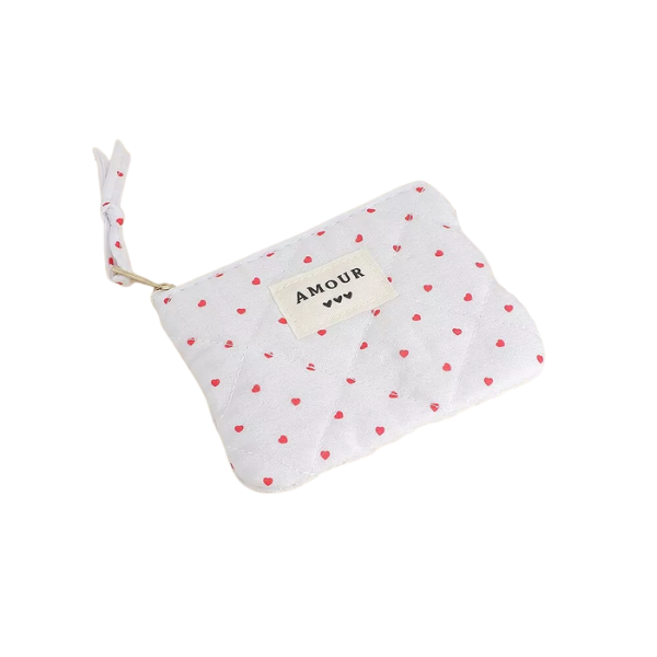 Un petit format plein de charme pour garder précieusement vos pièces, cartes ou petits trésors ! Ce porte-monnaie en coton côtelé séduit par ses jolis motifs graphiques et son inscription brodée "AMOUR" accompagnée de trois cœurs.