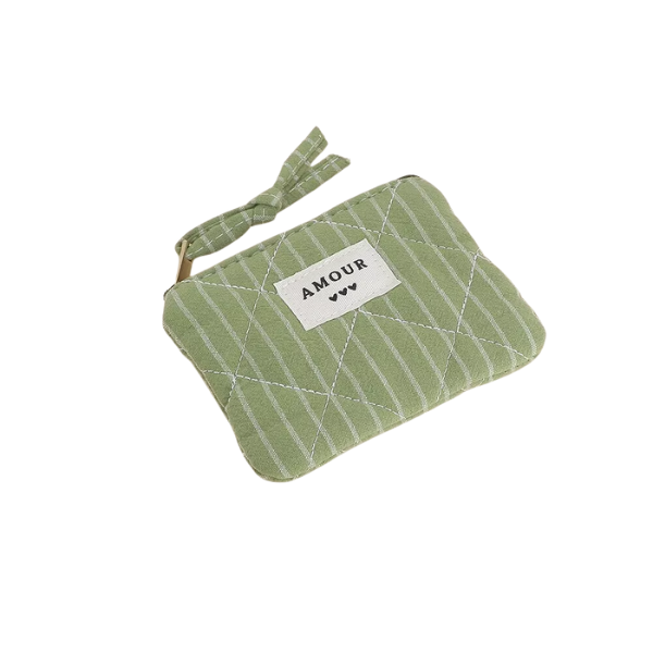 Un petit format plein de charme pour garder précieusement vos pièces, cartes ou petits trésors ! Ce porte-monnaie en coton côtelé séduit par ses jolis motifs graphiques et son inscription brodée "AMOUR" accompagnée de trois cœurs.